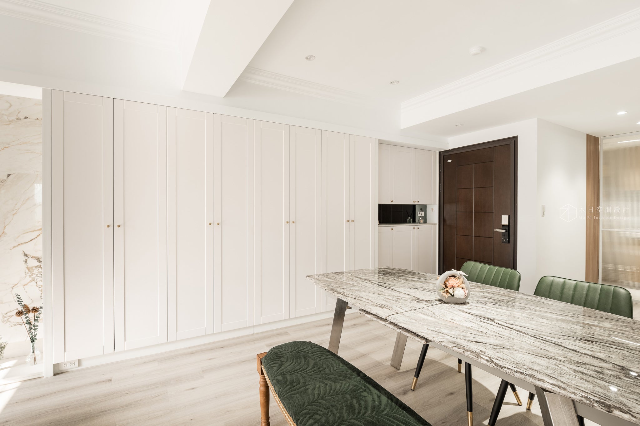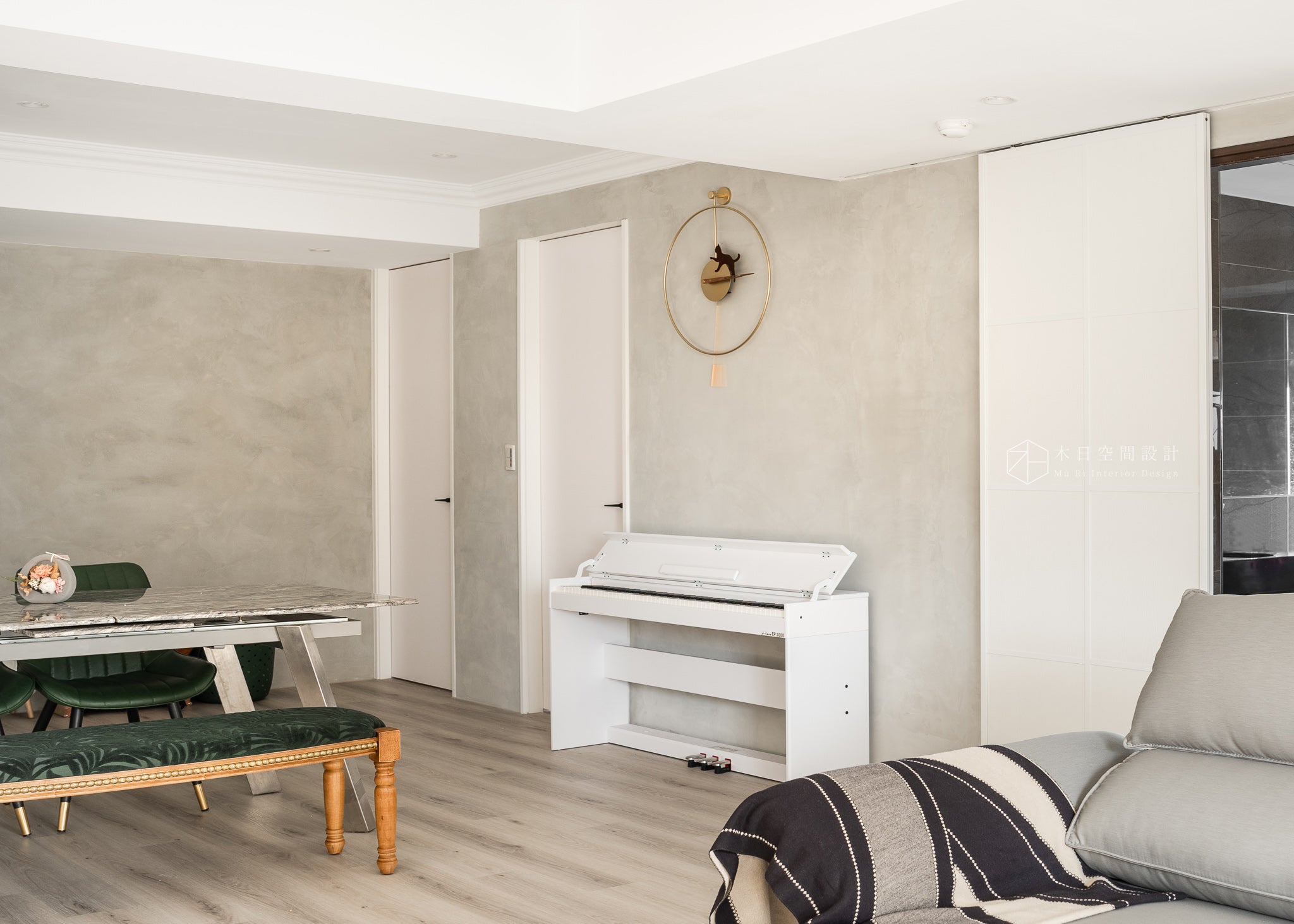 客廳及用餐區採用深淺交錯、灰白相間的地板,為整個空間注入了一種輕盈、明亮的氛圍,同時也讓它看起來更加現代與時尚,簡約卻又不失溫馨和舒適。地板與其他元素的結合,呈現出一種灰/灰白色調的統一感,使整個空間顯得非常和諧。而電視牆的微奢感飾板,十足的畫龍點睛,讓家增添一些高級場域的感受。