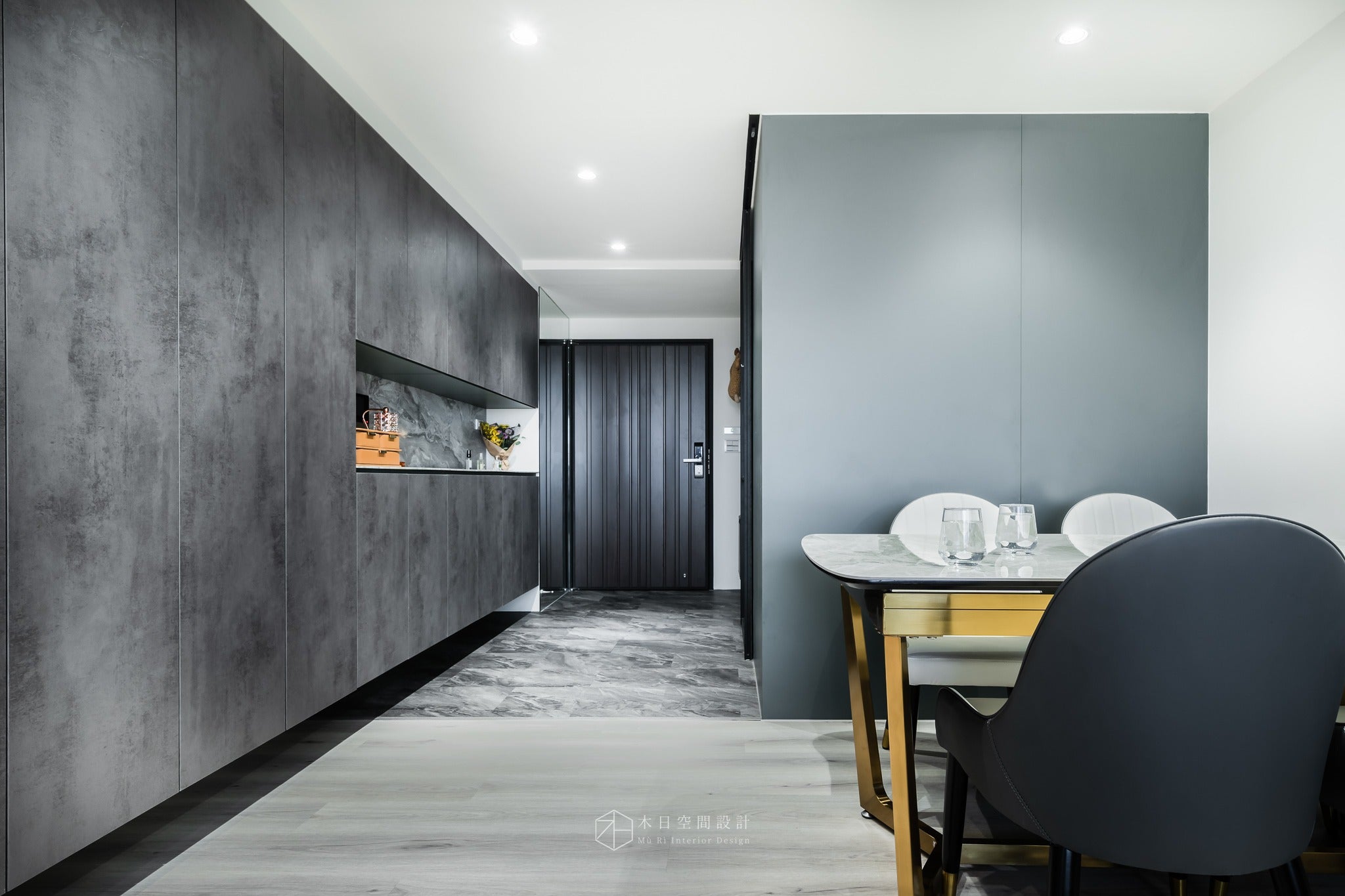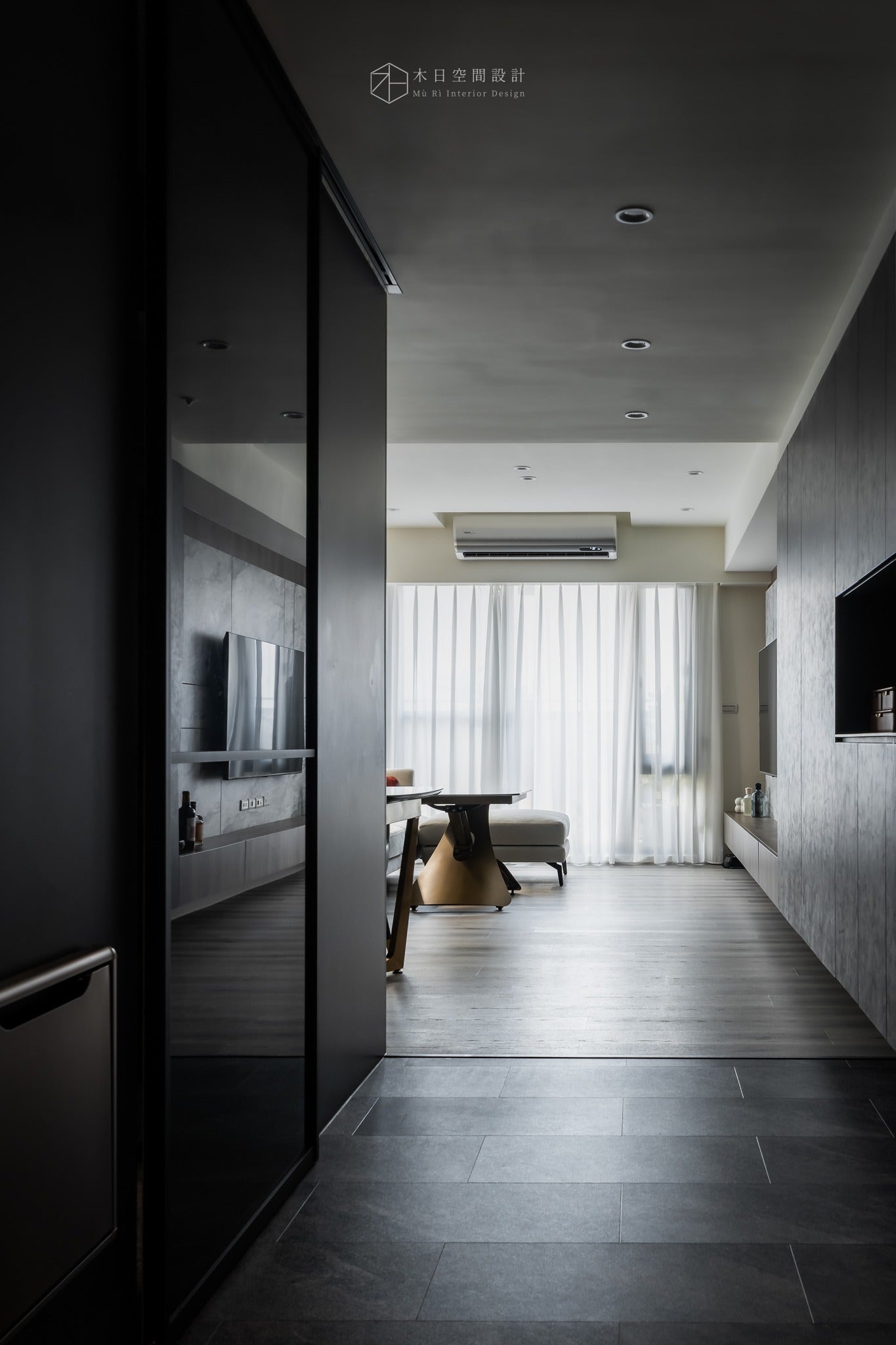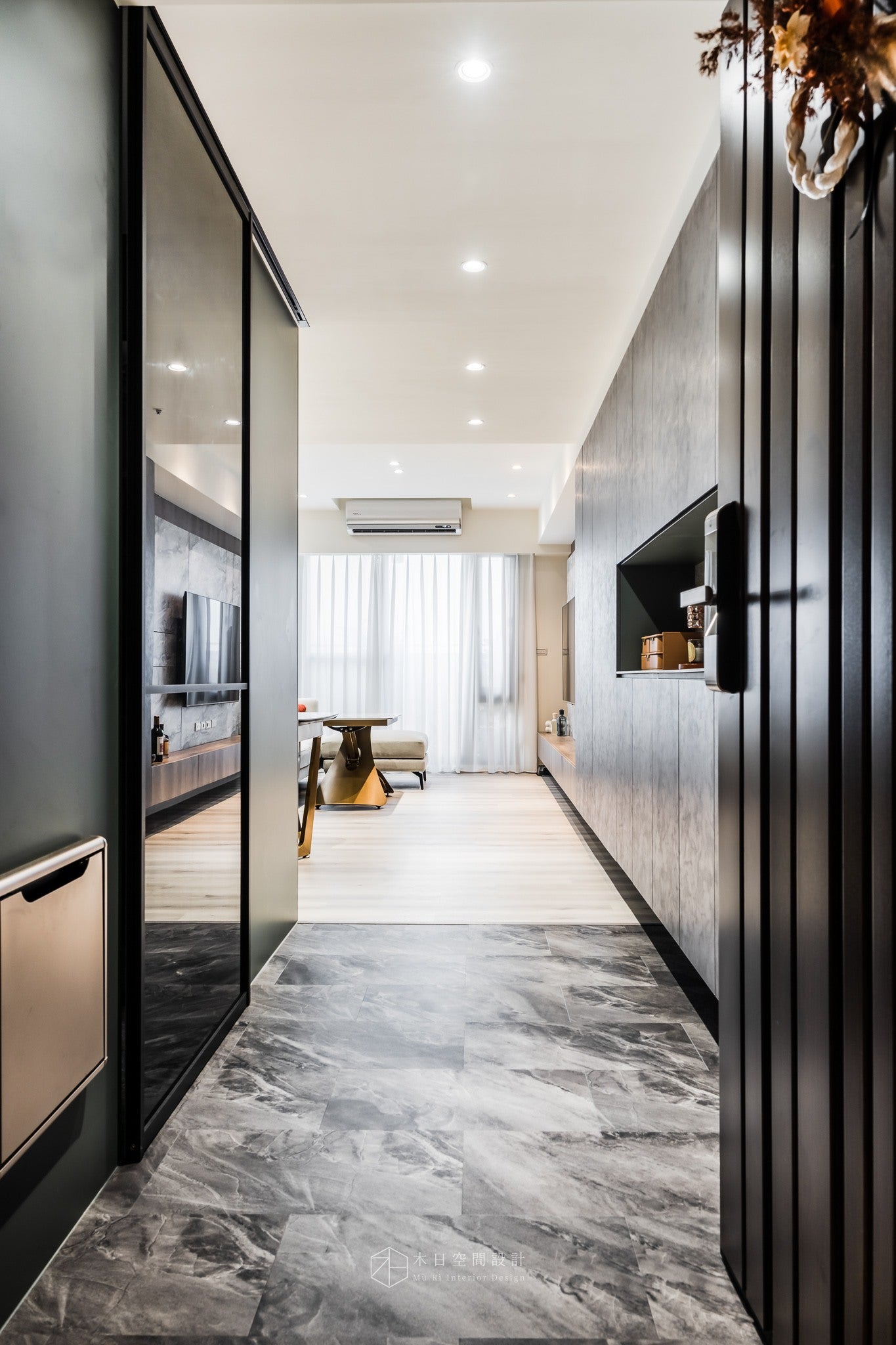 整個空間都是深色,卻又各自有變化。大門最深,左側櫃體次之,地板深淺變化較多,右側則是素色最為乾淨現代。