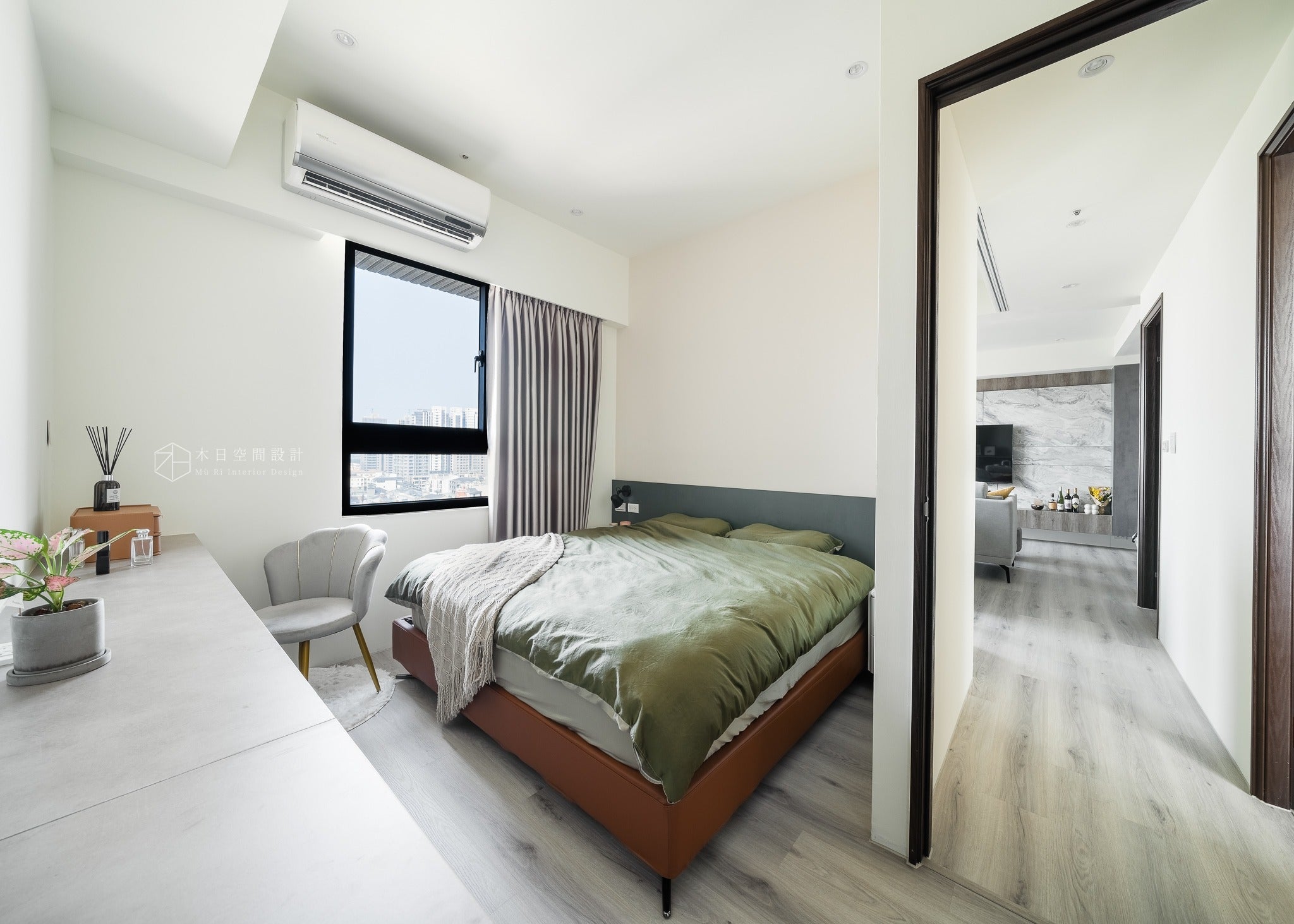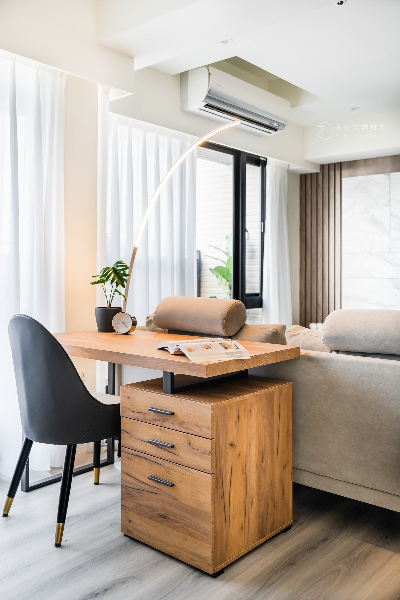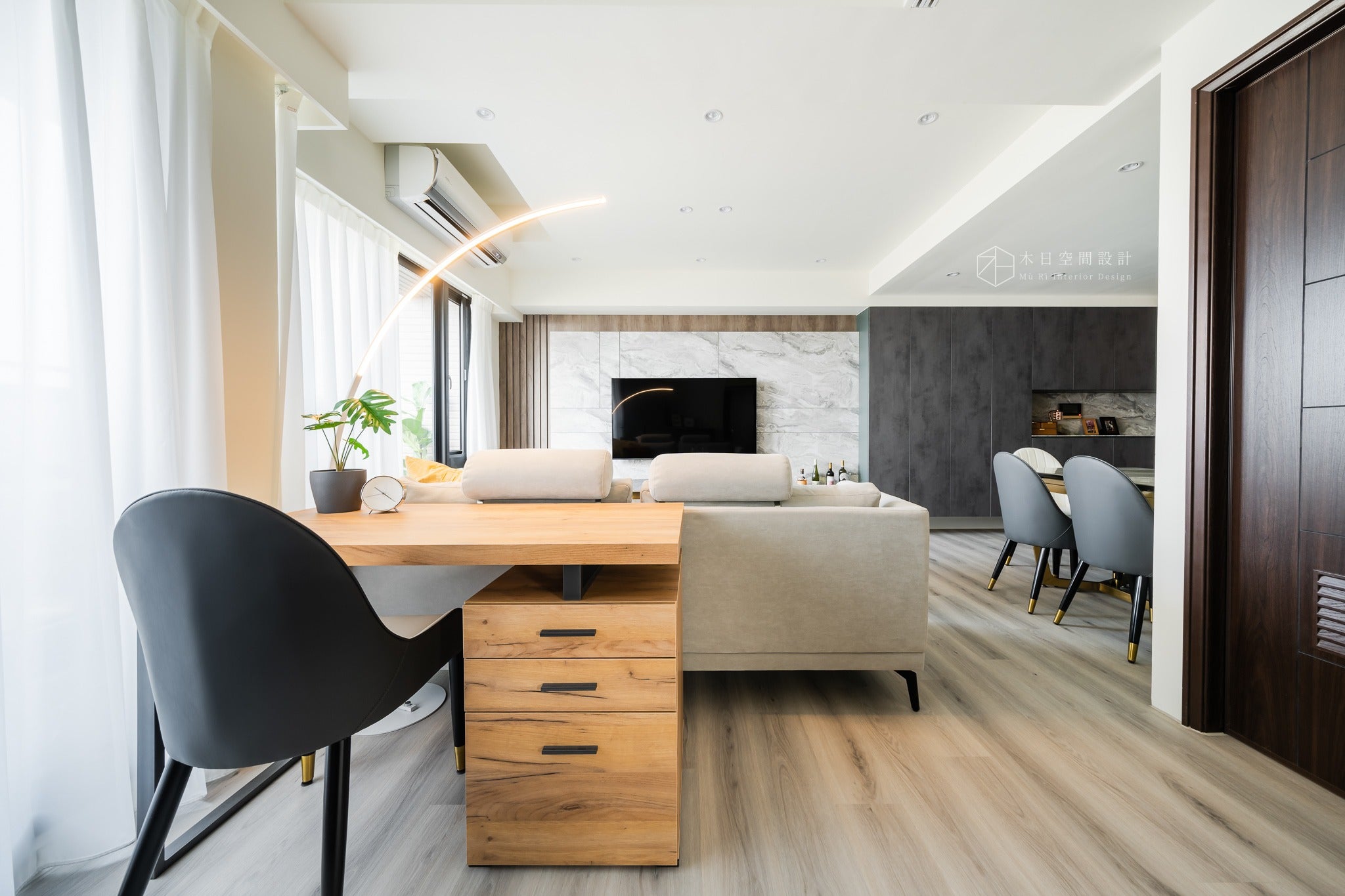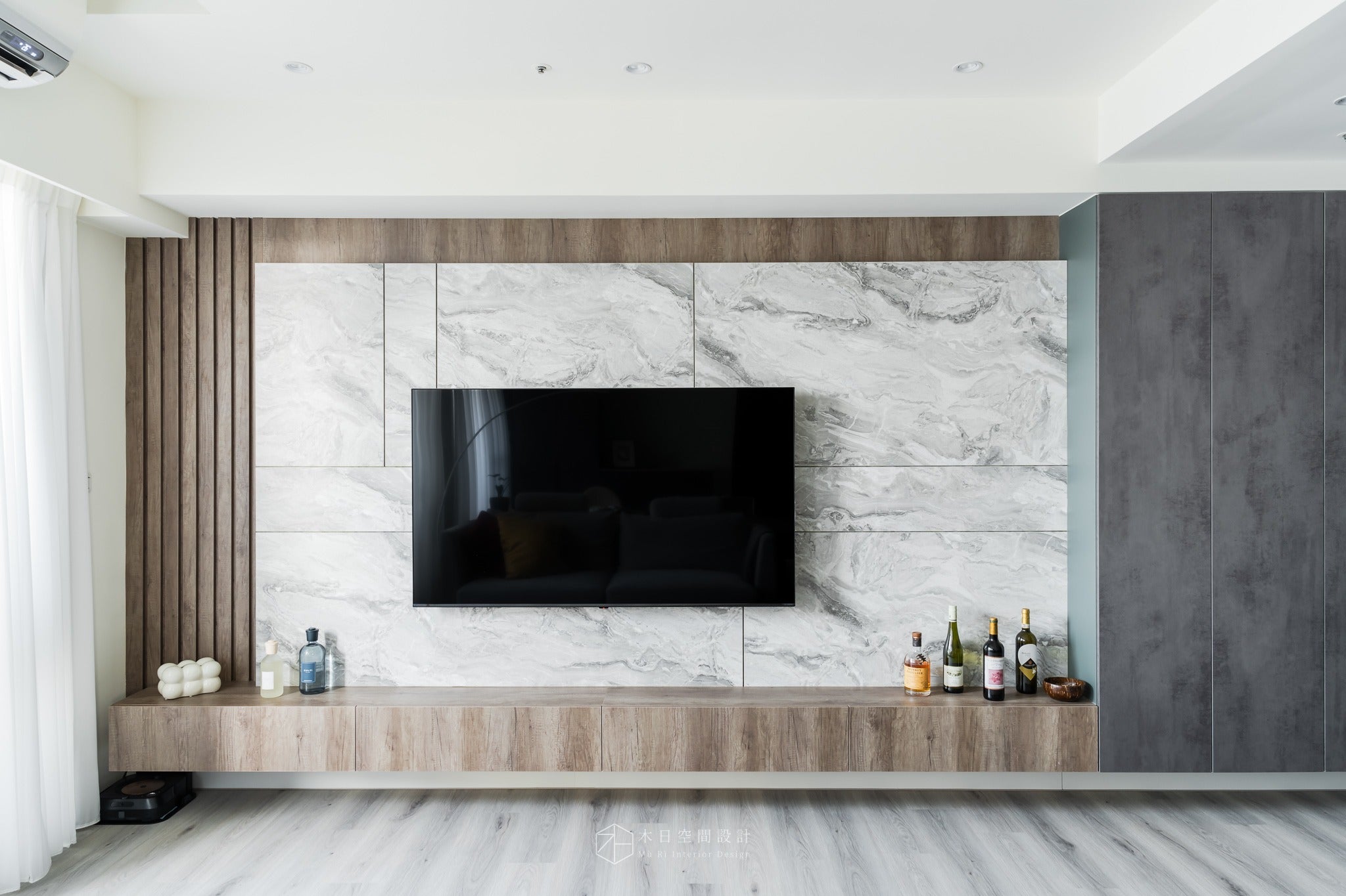 整個空間都是深色,卻又各自有變化。大門最深,左側櫃體次之,地板深淺變化較多,右側則是素色最為乾淨現代。