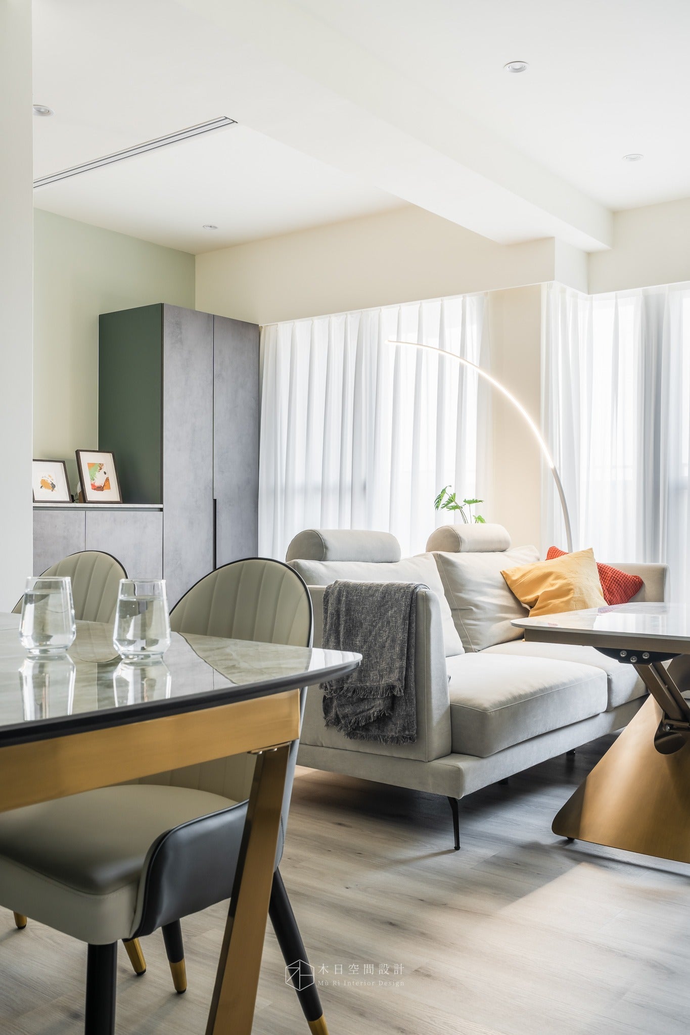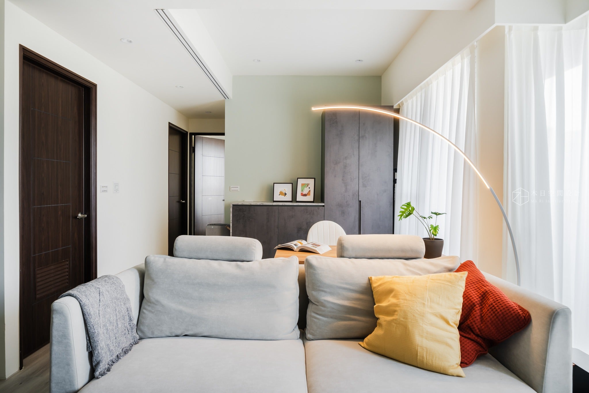 廚房與大門落塵區選擇了更為深色且帶有石頭紋路的SPC地板,與客廳做了分隔。