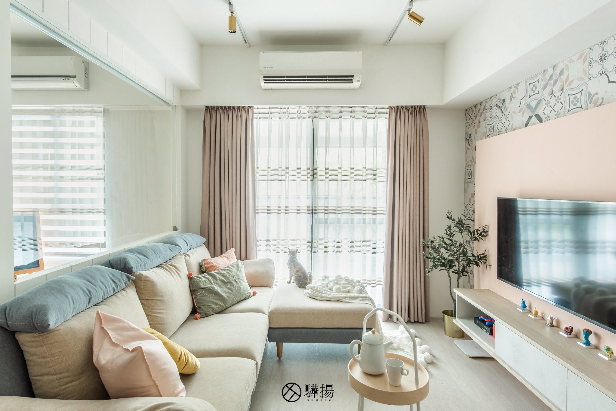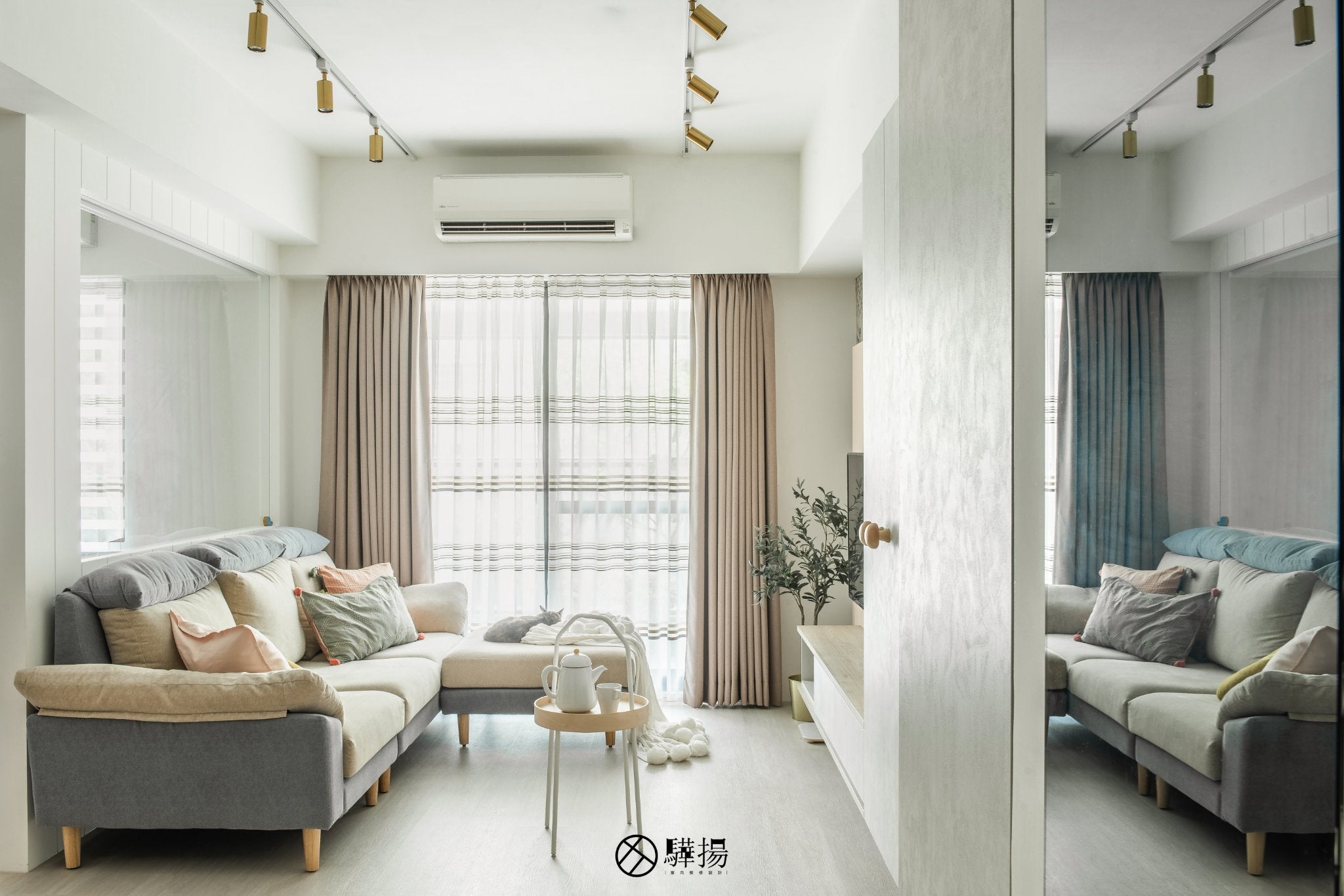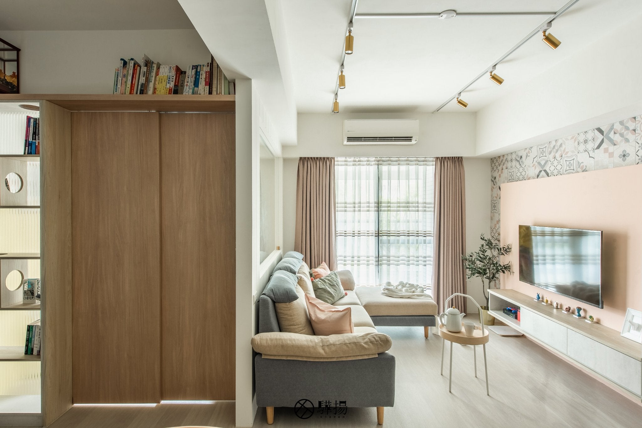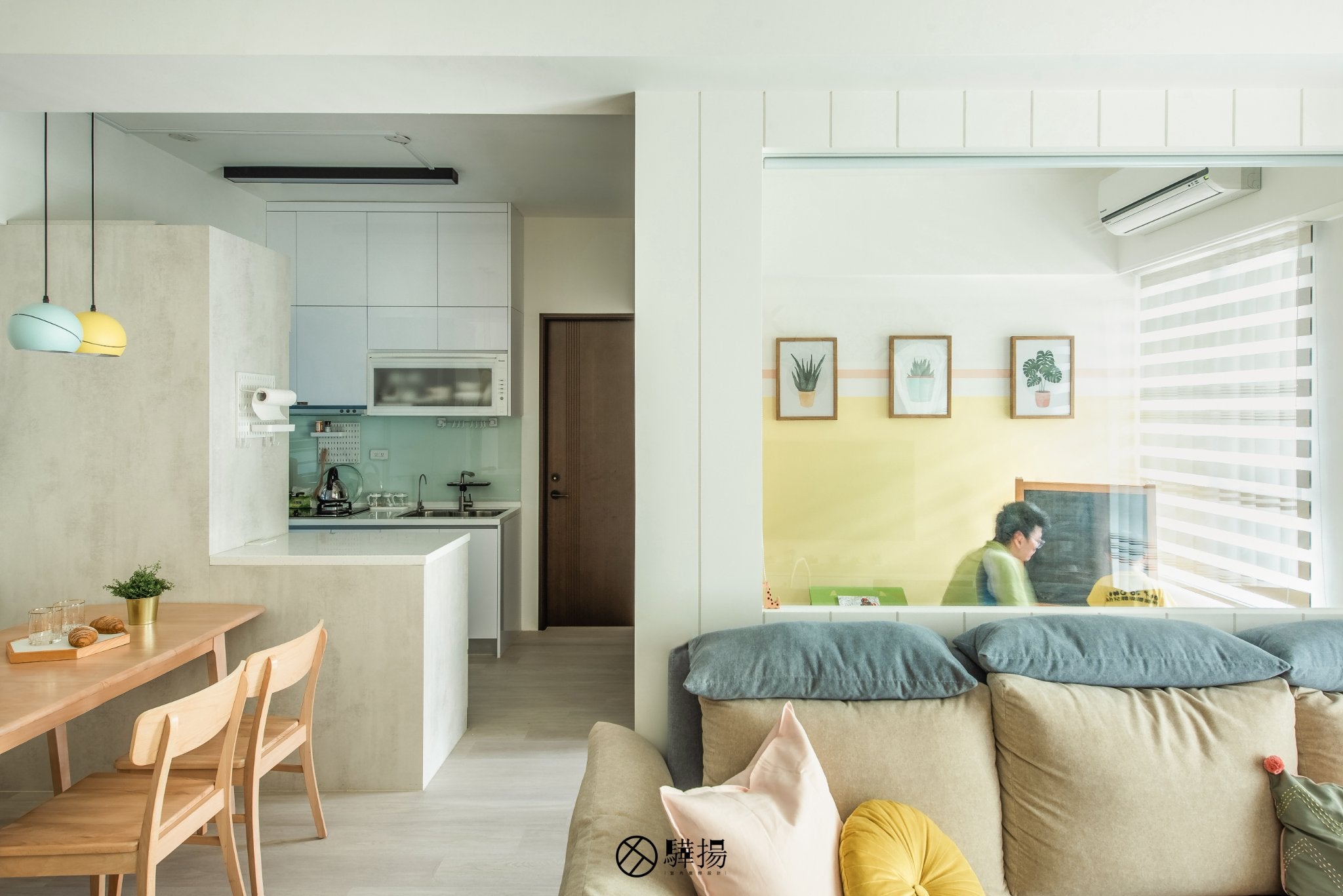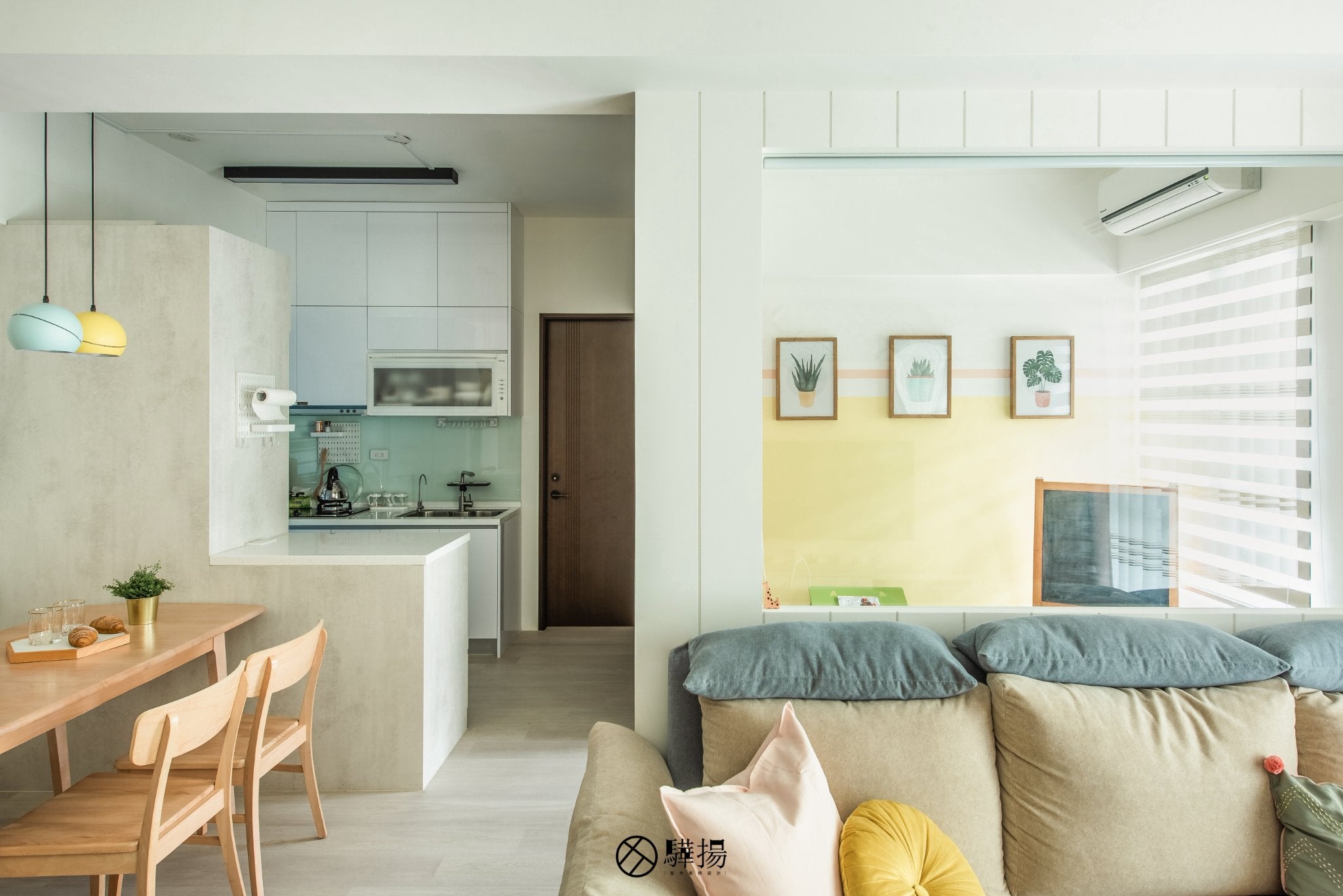 色彩豐富多樣卻維持著低彩度,不會過於熱鬧繁複反倒顯得簡約舒服,讓人一回到家就覺得神清氣爽,選擇白色系的地板讓空間更為放大,且增添不少優雅氣質的感覺。