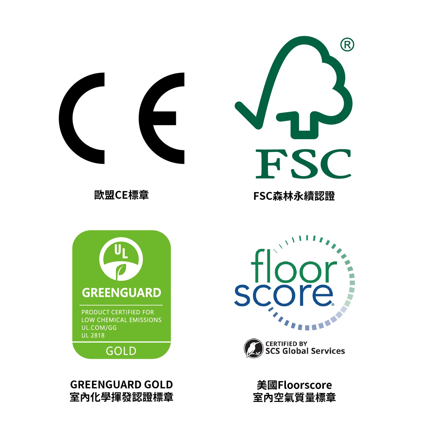 FSC森林永續認證、GREENGUARD GOLD、Floorscore室內空氣質量標章。